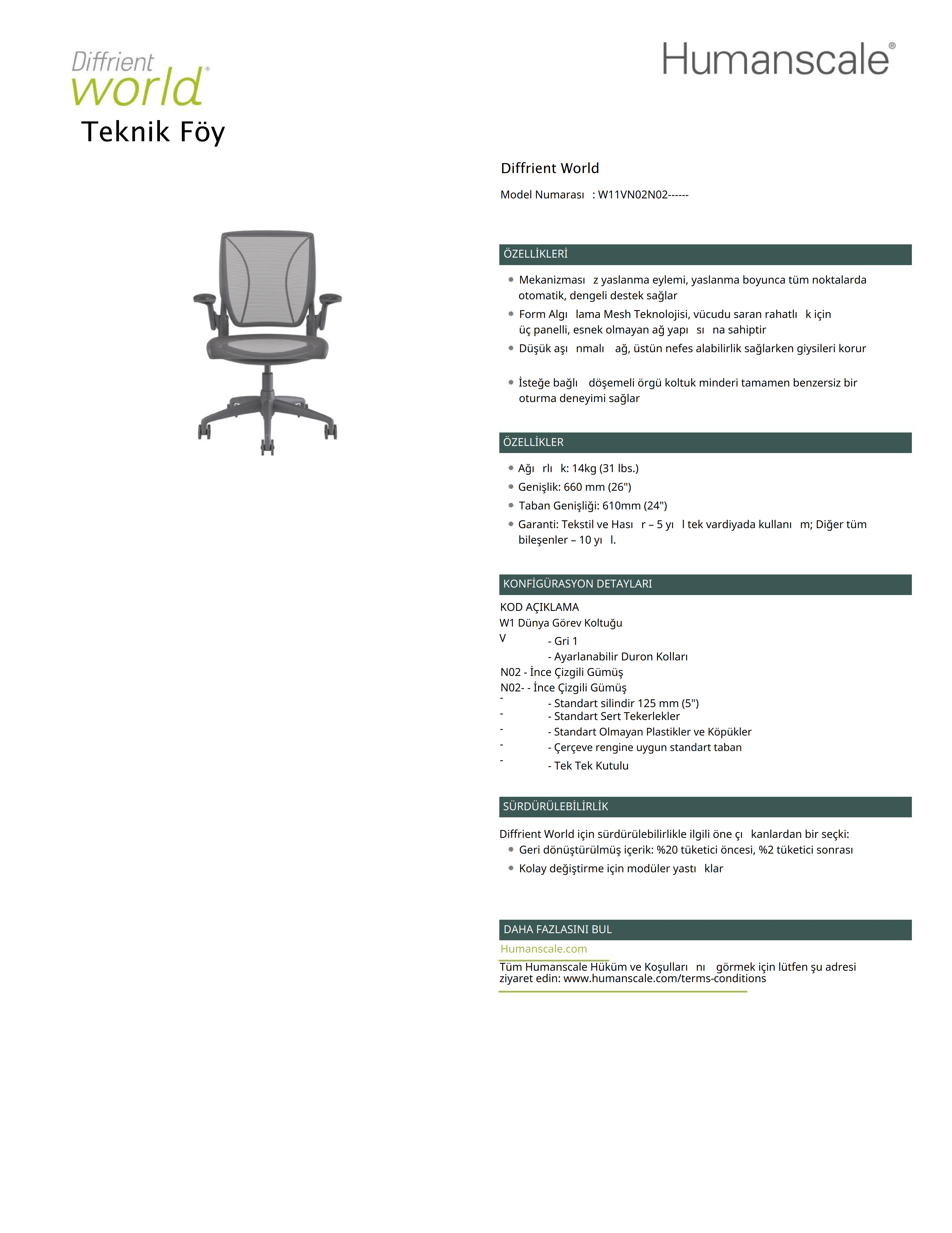Lider tasarımcı Niels Diffrient’in tasarladığı Diffrient World Çalışma Koltuğu, özel sırt – bel desteği ve yenilikçi üç panelli file sırtlığı ile, tüm Humanscale’nin ürünleri gibi sade, güzel ve işlevseldir. Tasarım, geleneksel mekanizmalara duyulan ihtiyacı ortadan kaldırır, fizik yasalarını ve kullanıcının vücut ağırlığını kullanarak, mükemmel bir konfor sunmaktadır.